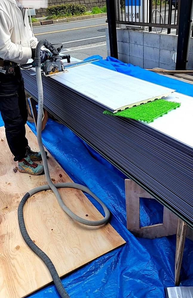 今回は金属サイディングを採用いよいよ新しいサイディングボードを建物に貼っていきます。